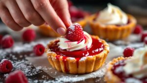 Die Cremebasis variiert je nach Jahreszeit und Törtchensorte. Für die fruchtigeren Frühjahrsvarianten wird häufig eine leicht stabilisierte Crème légère verwendet – eine mit geschlagener Sahne gestreckte Crème pâtissière, die luftig wirkt, ohne instabil zu werden. Für die dunklen Wintervarianten kommt eher eine Ganache oder eine Nougat-Buttercreme zum Einsatz, die dem Törtchen Körper und Wärme gibt. Diese Unterscheidung ist kein Zufall, sondern das Ergebnis jahrelanger Übung und eines sehr konkreten Verständnisses dafür, was eine Füllung zu tragen vermag.