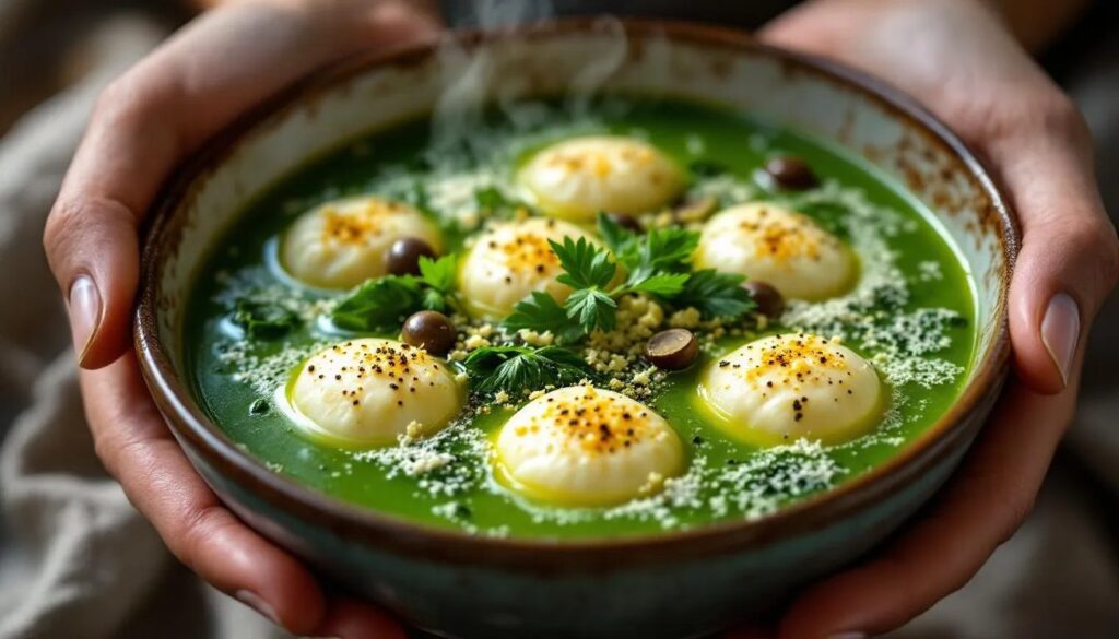 Das Besondere an dieser Suppe liegt im Zusammenspiel der drei Komponenten. Die Brühe selbst bleibt bewusst pur, damit das Gemüse sprechen kann. Die Parmesan-Nocken — Gnocchi di Parmigiano, als kleine, weiche Klößchen aus Eiern, geriebenem Käse und etwas Semmelbrösel — geben Tiefe und Schmelz. Die Oliven-Gremolata obenauf, inspiriert von der mailändischen Tradition, bringt Frische, einen leichten Biss und eine mediterrane Note, die den Frühling endgültig auf den Tisch holt. Wer das Kochbesteck zur Hand nimmt, wird in etwa 45 Minuten eine Suppe auf den Tisch bringen, die so grün schmeckt, wie der April aussieht.